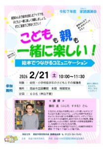 絵本とおもちゃの専門店「ろばのこ」(札幌市)の代表をお招きし、読み聞かせを子どもと一緒に楽しみながら、絵本の面白さを家族で共有する「家読(うちどく)」の楽しさをわかりやすく伝えていただきます。ぜひご家族でご参加ください。